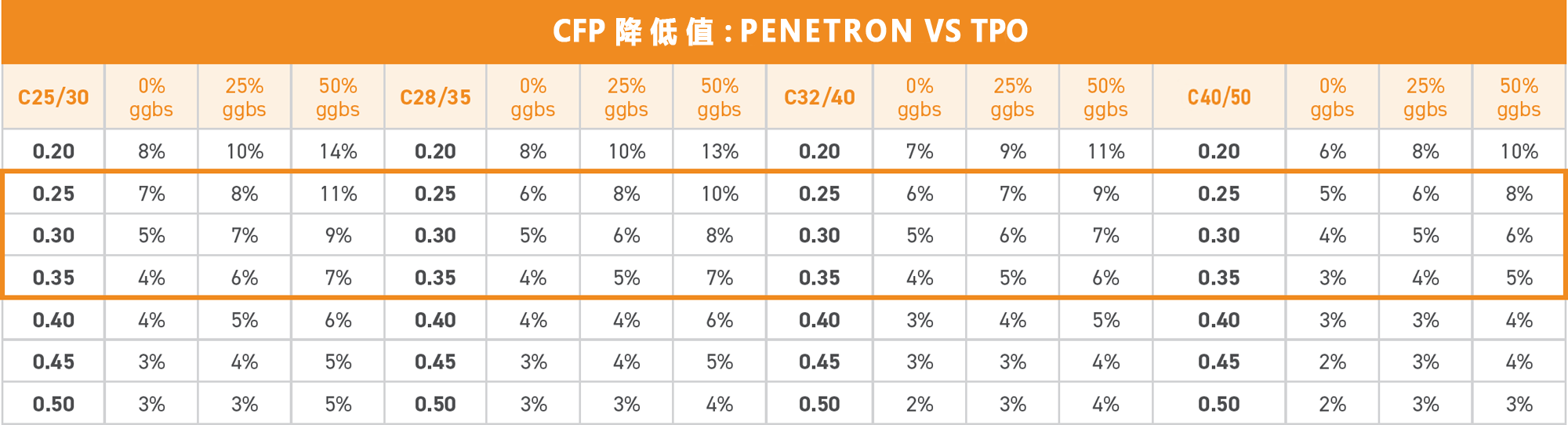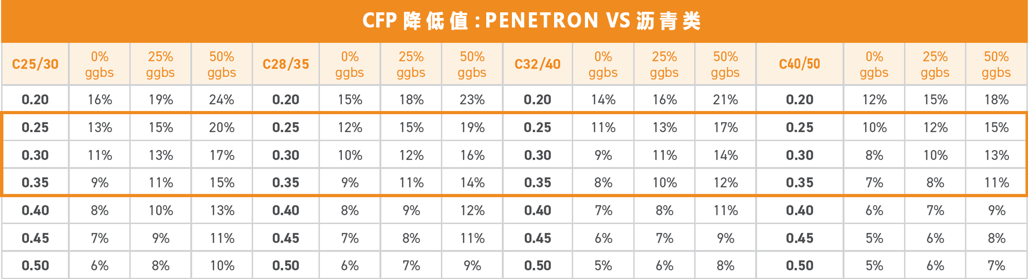 按照結(jié)構(gòu)平均厚度0.25-0.35m計算每平方米混凝土的CFP,將PENETRON ADMIX 澎內(nèi)傳混凝土防水添加劑(PNC803)與上述表面處理方案進行比較?,結(jié)果見右表。